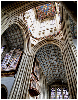 The elaborately decorated roof of the Abbey church at Bury St Edmunds, Suffolk. It